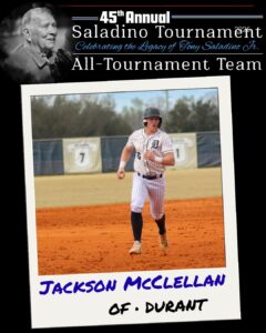 The Bulls entire staff had everything working all tournament. Osting, the tournament’s Most Valuable Player, opened up pool play with a six-inning, one-run win against Durant; Luke Long and Gavin Mathis combined for 14 strikeouts against Newsome, allowing just one run on one hit; Eli Edwards also through a one-hitter against Lennard; and Javi Navas-Hoyer scattered three hits in five shutout innings against Gaither in the semifinals, before Evan Plusquellic finished off the Cowboys with four strikeouts in his two-inning save.