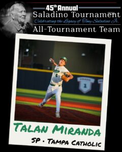Tampa Catholic came into the Saladino Tourney final unbeaten through pool-play and the semifinals, but it took four nail-biting victories to do so. The Crusaders’ won those games by a total of five runs and Christian Serralles was the last pitcher to touch the ball in all of them.